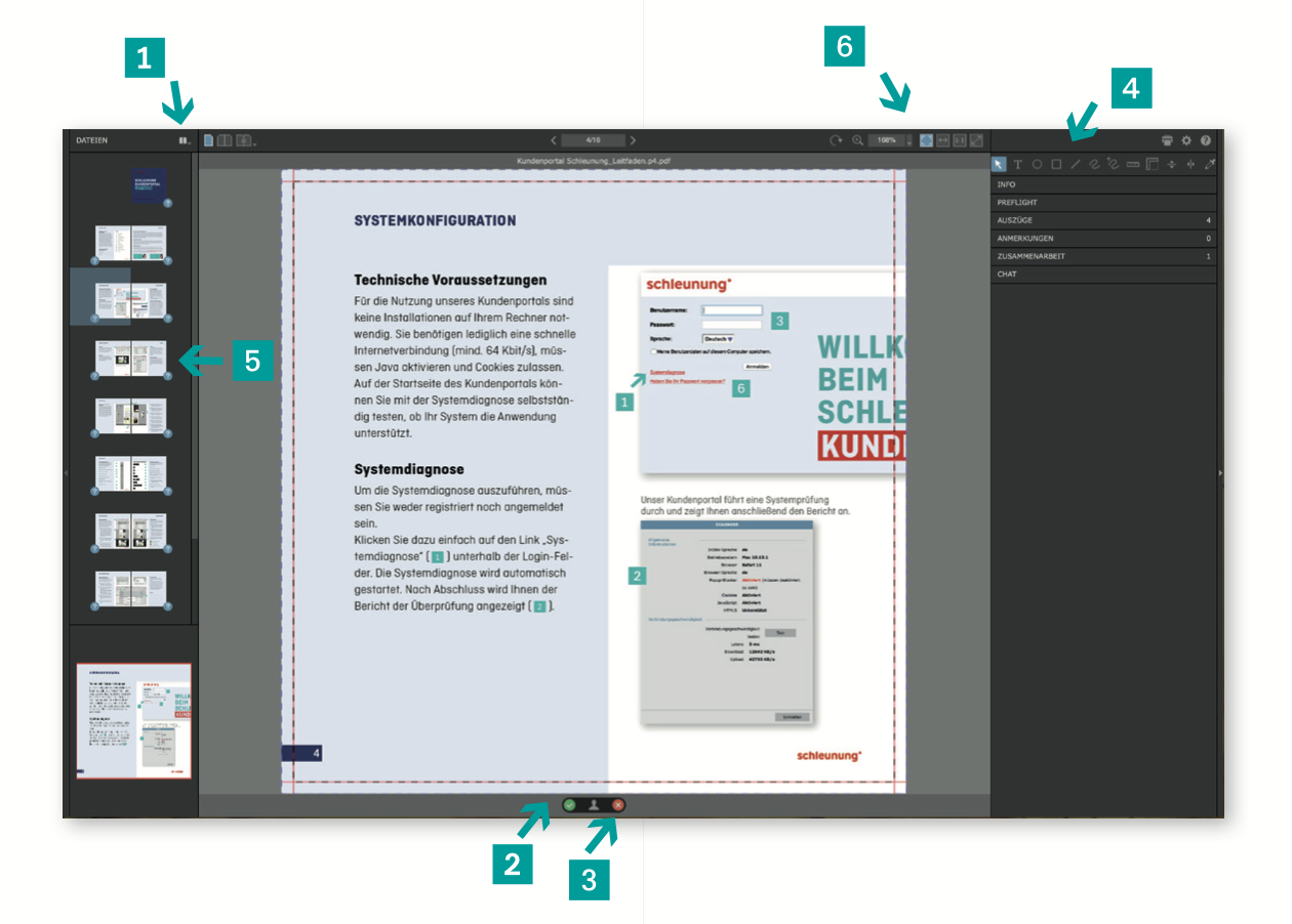 Sie finden mehrere Anmerkungswerkzeuge, um die Seiten zu bearbeiten, etwa indem Sie Kommentare einfügen oder Elemente markieren. Mit weiteren Werkzeugen wie Hilfslinien, Lineal und rechtem Winkel sind Sie in der Lage, die Position der einzelnen Elemente zu überprüfen. Mit den Navigations-Tools können Sie die Seiten vergrößern bzw. verkleinern, sie drehen oder zwischen ihnen wechseln. Wählen Sie auch zwischen Einzel- und Doppelseitenansicht.